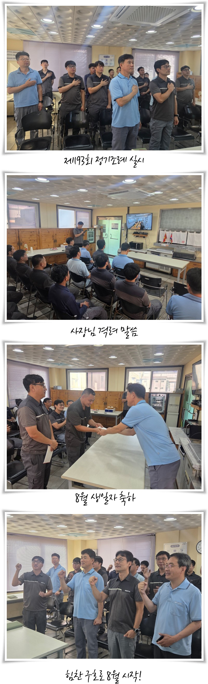 아울러, 사장님께서는 올해 하반기에도 많은 어려움과 도전이 있겠지만, 우리 모두가 계획된 일들을 차근차근 실행에 옮겨 나간다면 반드시 좋은 성과를 이룰 수 있을 것이라고 격려의 말씀을 전하셨습니다. 특히, 사장님께서는 팀워크와 신뢰를 바탕으로 안정적이고 체계적인 실행이 중요하다는 점을 강조하시며, 각자의 자리에서 맡은 바 역할에 최선을 다하고, 서로 협력하여 시너지를 낼 수 있도록 함께 노력해 나가자고 당부하셨습니다.