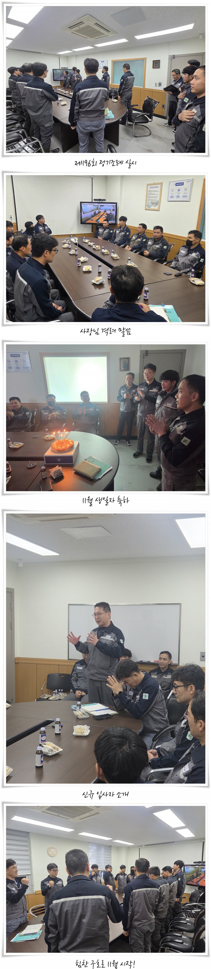 사장님께서는 11월은 한 해의 결실을 알차게 마무리하기 위한 중요한 시기라고 말씀하시며, 지금까지의 노력이 헛되지 않도록 각자의 자리에서 끝까지 최선을 다해주길 당부하셨습니다.